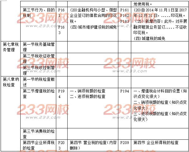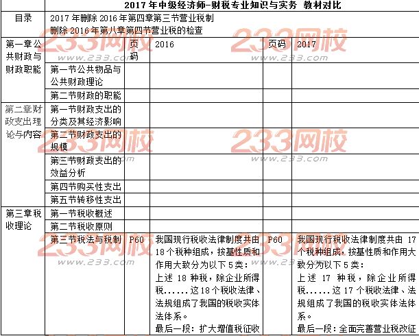 2017年中级经济师财政税收专业教材变化之处主要是在营改增部门,涉及到营改增知识内容都有变化,删除2016年第四章中第三节的营业税制,第八章第四节营业税制的检查也删除了。