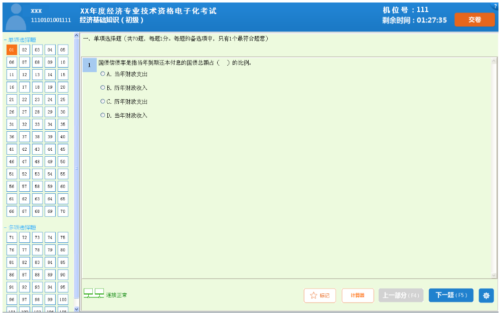 标题栏从左到右,依次显示应试人员基本信息、本场考试科目名称、机位号、考试剩余时间、“交卷”按钮。