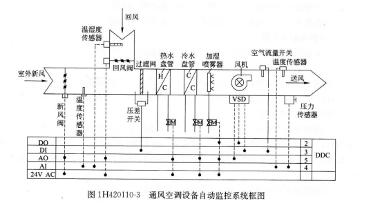 通风空调设计要求:对风阀的自动调节来控制空调系统的新风量以及送风风量的大小;对水阀的自动调节来控制送风温度(回风温度)达到设定值;对加湿阀的自动调节来控制送风相对湿度(回风相对湿度)达到设定值;对过滤网的压差开关报警信号来判断是否需要清洗或更换过滤网;监控风机故障报警及相应的安全联锁控制;电气联锁以及防冻联锁控制等。安装公司根据设计院提供的通风空调设备自动监控系统框图(见图1H420110—3),对通风空调设备系统进行了调试检测。