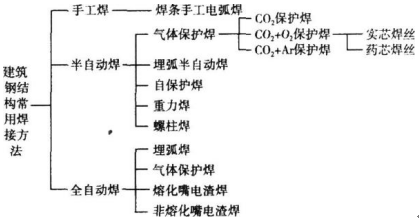 解析: 建筑工程中钢结构常用的焊接方法:按焊接的自动化程度一般分为手工焊接、半自动焊接和全自动化焊接三种,具体分类如下图所示: