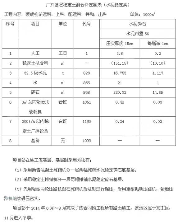 某新建一级公路工程K11+120~K20+260合同段位于海拔3000M以上的地区,;路面结构设计示意图如下图所示,该合同段工程与其他工程或 已有道路无交叉。依据交通运输部颁布的《公路工程基本建设概预算编制办法》(JTG B06-2007),《公路工程预算定额》(JTG/TB06-02-2007)编制的该工程施工图预算,其中K11+120~k12+120成基层工程 为:22300㎡(或基层平均面积)。
