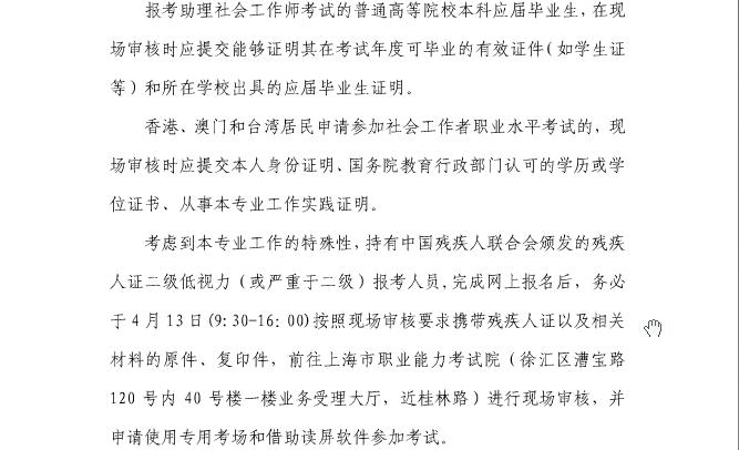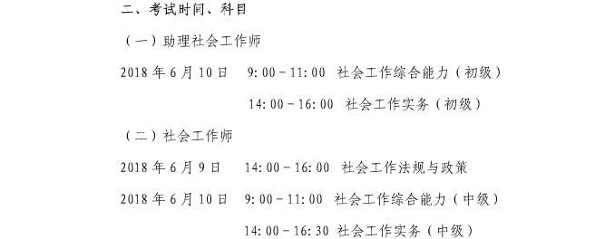 2018年上海市社会工作者职业水平考试考务工作安排(图片版):报名时间3月30日至4月15日,现场审核时间4月13日至15日,准考证打印时间6月5日-7日,考试时间6月9日、10日。
