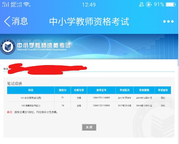 根据下图教师资格证笔试成绩示例,教师资格证报告分满分120分,70分及以上为合格。