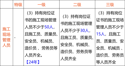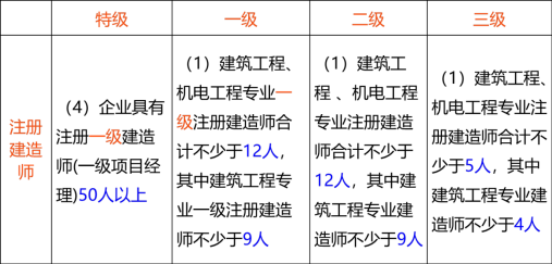 D.建筑工程、机电工程专业注册建造师合计不少于5人,其中建筑工程专业建造师不少于4人