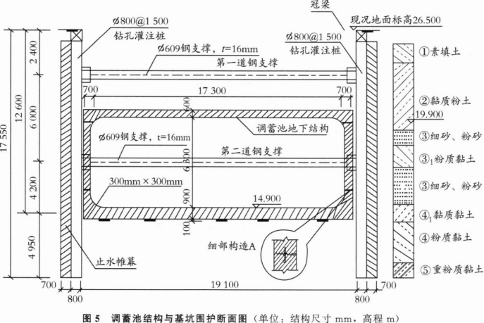某公司承建城市桥区泵站调蓄工程,其中调蓄池为地下式现浇钢筋混凝土结构,混凝土强度等级为C35,池内平面尺寸为62.0m×17.3m,筏板基础。场地地下水类型为潜水,埋深6.6m。设计基坑长63.8m、宽19.1m、深12.6m,围护结构采用φ800mm钻孔灌注桩排桩+2道巾609mm钢支撑,桩间挂网喷射C20混凝土,桩顶设置钢筋混凝土冠梁。基坑围护桩外侧采用厚度700mm止水帷幕,调蓄池结构与基坑围护断面如图5所示。