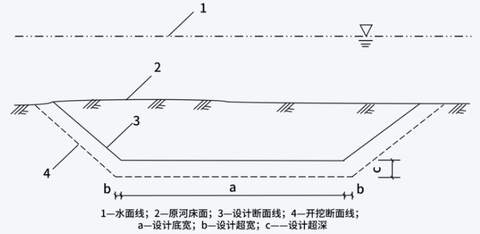 事件二:某段河道疏浚完成并经监理机构验收合格后,施工单位根据《疏浚与吹填工程技术规范》SL17-2014,向监理机构报送的水下疏浚工程量为90万m³,其中包括设计断面方量75万m³,计算超宽工程量2万m³,计算超深工程量13万m³,监理机构审核后确认按设计断面方量75万m³进行结算,该河道开挖工程量计算断面如图1所示。