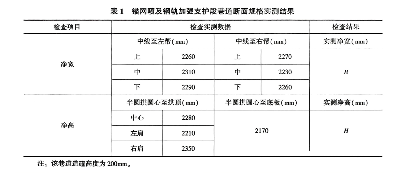 巷道掘进通过断层带后,监理工程师对该段工程的支护质量进行了检查,加强支护段长度为20m,巷道断面规格工序验收资料显示全部合格。现场巷道断面检查中,随机抽查的1个断面实测结果如表1所示。