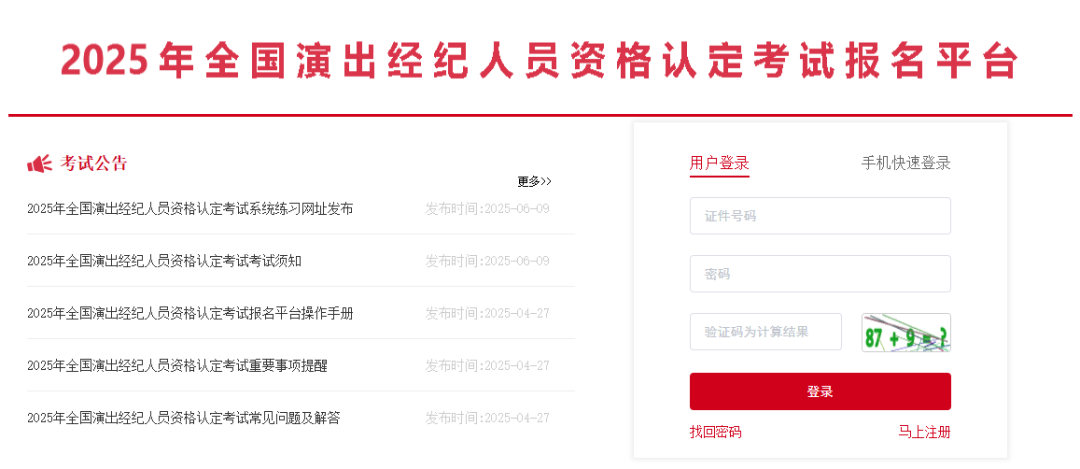 6月9日9:00起,已报考2025年演出经纪人员资格认定考试的考生,可登录考试报名平台下载准考证并自行打印。请考生妥善保管纸质准考证,提前查看准考证上的考试地点,阅读考试须知等相关信息。考试当天需要携带纸质准考证和报考时填报的本人有效身份证件原件进入考场。