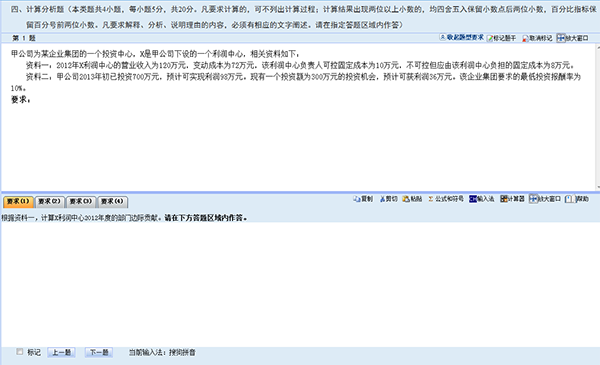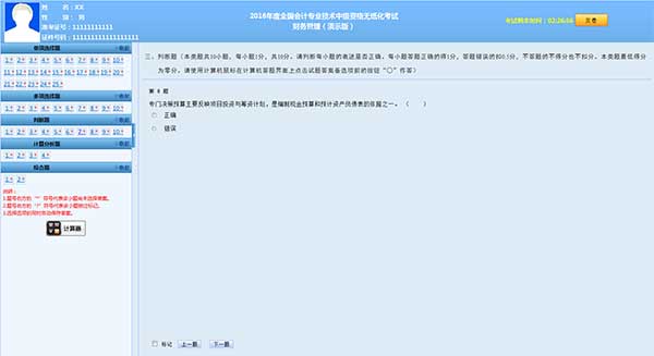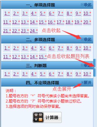 1. 根据考试科目不同,题目类型分为单项选择题、多项选择题、判断题和不定项选择题。题号右方的“*”号表示该小题还未作答,“?”号表示该小题做过标记。考生可以通过题号列表查看本考试科目全套试卷的作答情况(包括每道试题的已答或未答状态、标记状态),还可点击各题号按钮,直接进入各试题进行答题或检查。