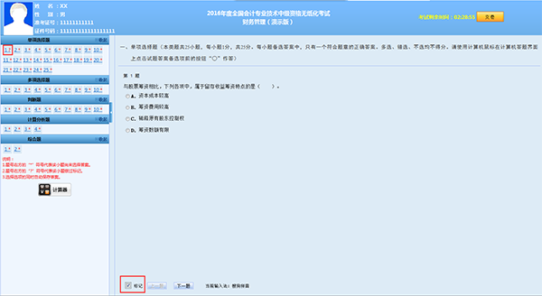 2. 考生在答题过程中,如对当前试题选项不确定,可点击“标记”前的选择框(下图红框处)进行标记,以方便回看该试题;用鼠标再次点击该选择框可以取消该试题标记。被标记的试题,会在题号右方以“?”进行显示。对试题所作的标记,不会被作为答题结果,也不会影响考生得分情况。考生如合理使用试题标记功能,可以在大量的试题中快速查找到需要重点检查的试题。